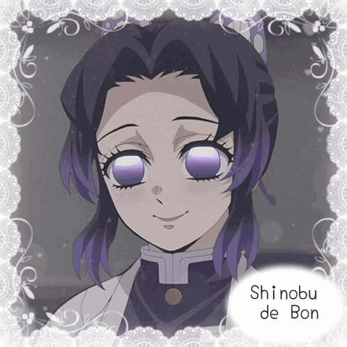 Shinobu Kocho from Demon Slayer, an anime character with purple hair and eyes, featured with text "Shinobu de Bon".
