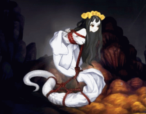 An illustration of Shirohebi Muramasa, a snake-like character, bound with red ropes in a shibari style.