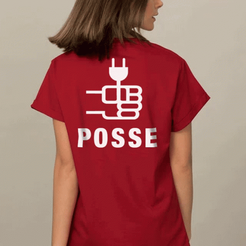 A woman models a red t-shirt featuring a white 'POSSE' logo with an electrical plug design.