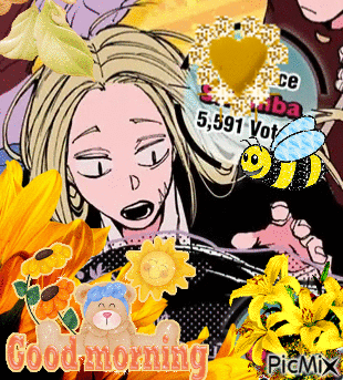 Shishiba from Sakamoto Days in a 'Good Morning' graphic with flowers and a bee.