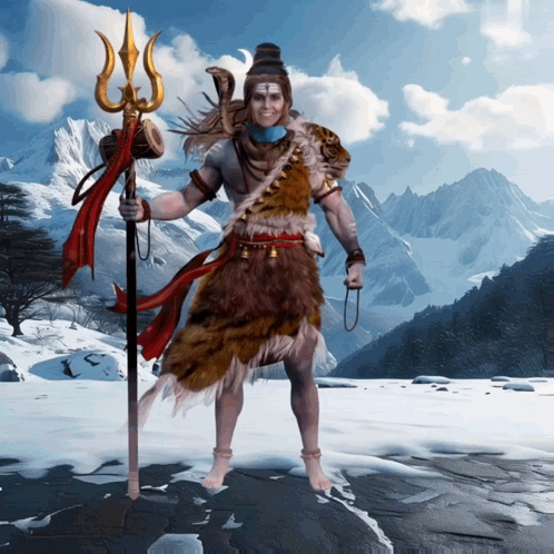 Lord Shiva, also known as Shiv Bhagwan Shiv Ji, stands majestically in a snowy mountain landscape, holding his trident.