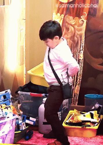 a young boy is standing in front of a pile of toys and a sign that says salmanholicbhai