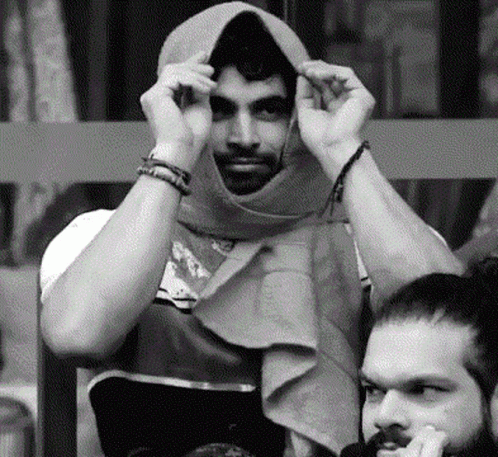 Shiv Thakare playfully covers his head with a scarf, looking directly at the camera while another man watches.