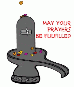 An animated drawing of a Shiva Lingam with falling flowers, conveying the message 'May Your Prayers Be Fulfilled'.