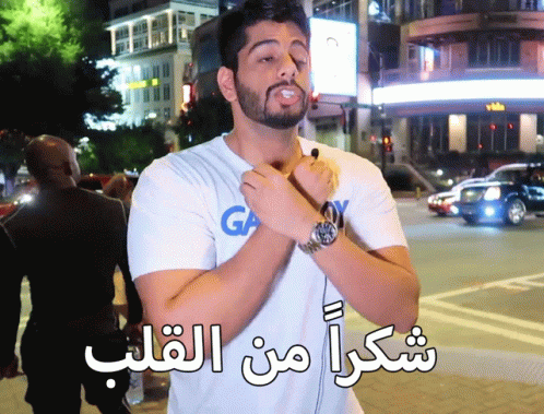 Ali Al-Bloushi expresses 'Thank you from the heart' on a city street at night, showing gratitude.