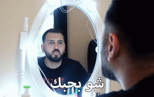 Khalil looks at his reflection in a mirror, expressing 'How much I love you' in Arabic.