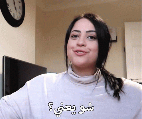 Sahar asks 'What does it mean?' with a smile, wearing a turtleneck sweater in front of a clock.