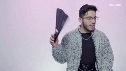 A man with glasses and a fuzzy jacket dramatically fans himself with a black hand fan, showing a shocked expression.