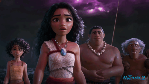 Moana, Loto, Kele, and Moni look shocked and surprised in a scene from Disney's Moana 2.
