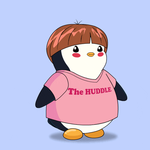 An animated Pudgy Penguin in a pink shirt reacts with a shocked expression, covering its mouth.