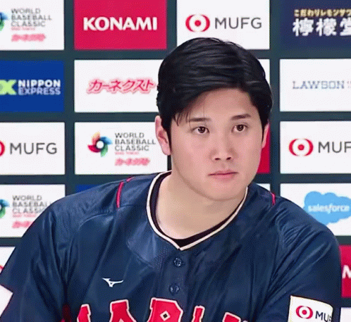 Baseball star Shohei Ohtani smiles and laughs during a press conference, wearing his Japan team jersey.