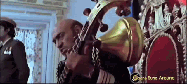 A bald man in uniform intensely sings and plays a stringed instrument, possibly a Sitar or Veena.