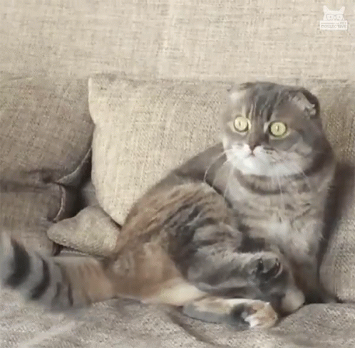 A Scottish Fold cat with wide, surprised eyes sits on a couch, looking startled by something off-camera.
