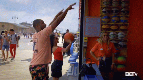 A man attempts to shoot hoops at a basketball game booth at a lively fun fair.