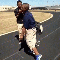 A man on a track field performs the energetic Shoot Gotem dance move, showcasing his moves.