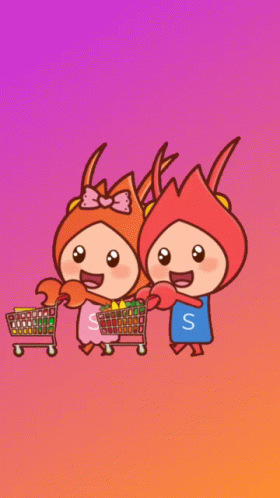Two adorable Shopee Mart mascots, one with a pink bow, happily push shopping carts filled with items.