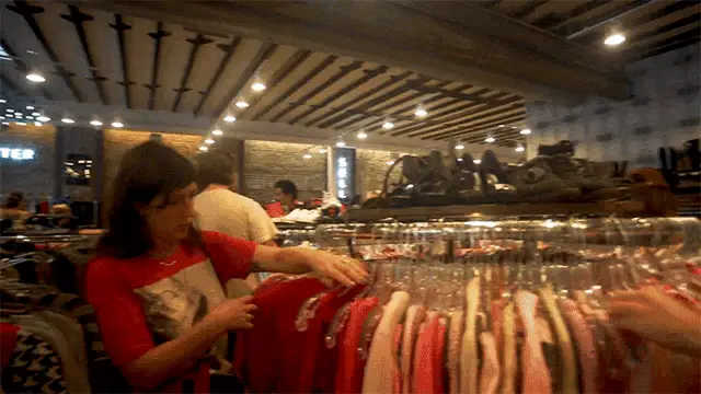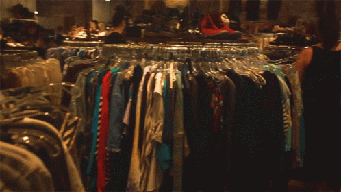 Fe Cortez experiences shopping madness at a thrift store, browsing racks of clothes and shoes in the Menos1Lixo spirit.
