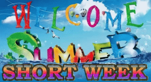 Animated welcome to summer and a short week, featuring colorful text, hot air balloons, and dolphins.