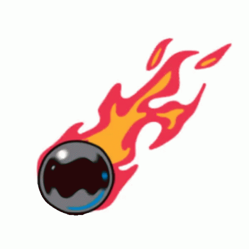 A dynamic cartoon illustration of a shot put ball engulfed in flames, suggesting speed and power.