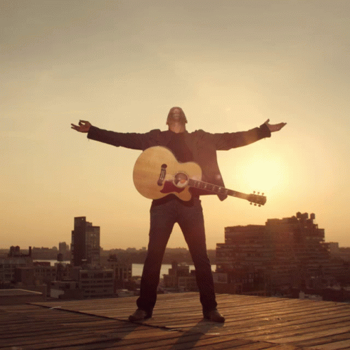 Darius Rucker stands on a rooftop with a guitar, arms outstretched, basking in the sunset over a city.