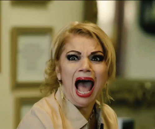 A woman with wide eyes and mouth open, screaming in fear or surprise.