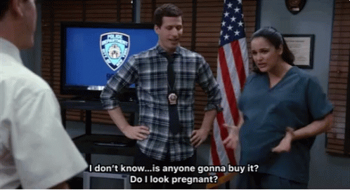 Amy Santiago from Brooklyn Nine-Nine asks if she looks pregnant while showing her belly.