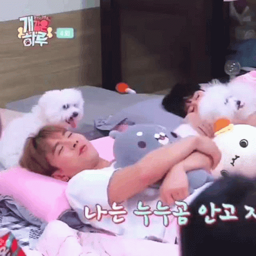Monsta X's Shownu (Son Hyunwoo) relaxes in bed, hugging a stuffed animal while two cute dogs lie nearby.