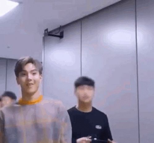Shownu from Monsta X laughing excitedly with his mouth wide open, wearing a grey and orange sweater.