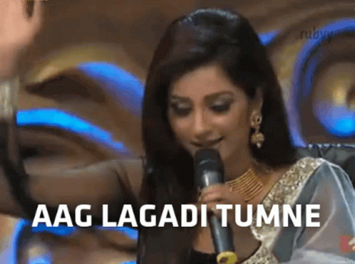 Shreyaghoshal delivers a powerful vocal performance on stage, with the on-screen caption 'Aag Lagadi Tumne' (You set fire) highlighting the energy.