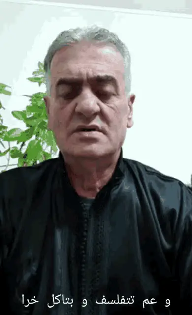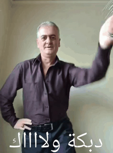 A man in a purple shirt and black pants performs an energetic Dabke dance, with the caption 'Dabke, wlaaak'.