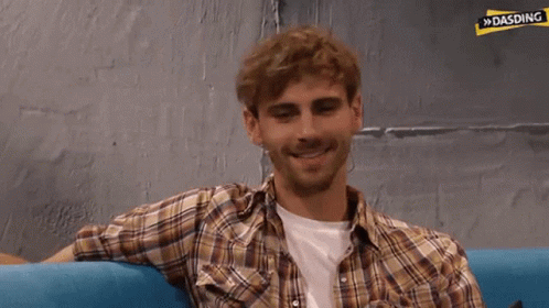 Fynn Kliemann shrugging on a blue couch, wearing a plaid shirt, with a slight smile.