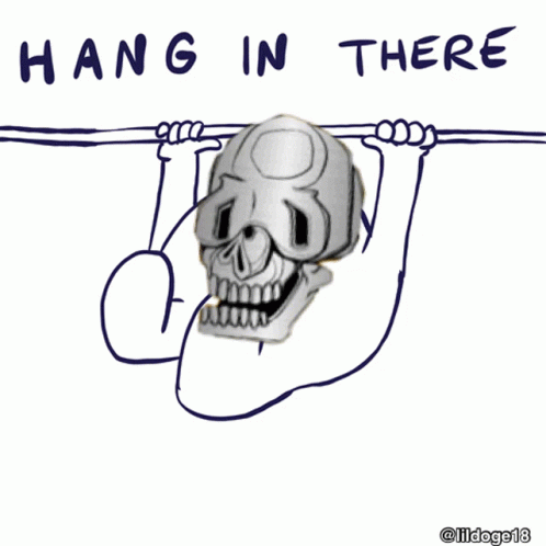A drawing by lildoge18 featuring a skull hanging from a bar with the encouraging message 'Hang In There'.
