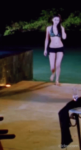 Shruti Haasan in a stylish black bikini with metallic accents, wet hair, picking up a white towel.