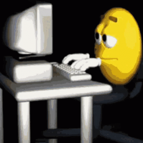 A yellow smiley face character, associated with Shto 7tv, intently types on a computer keyboard.