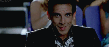 Ben Stiller as Derek Zoolander smiles mischievously in a theater, leaning forward with a happy expression.