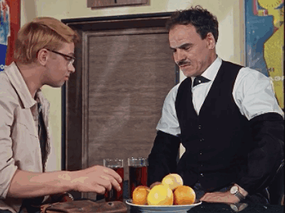 Shurik and the bartender at a table with fruit and drinks, as the bartender prepares a big pour.