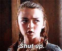 Arya Stark reacts with a direct 'Shut up,' her expression firm and determined.