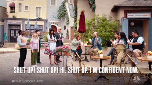 Chidi (William Jackson Harper) confidently declares 'Shut Up! Shut Up! Hi. Shut Up. I'm Confident Now.'