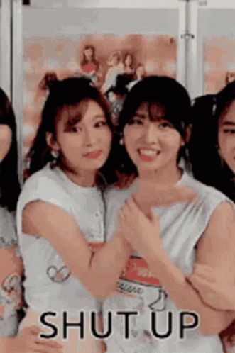 Two girls playfully interact, one covering the other's mouth with a hand, with 'SHUT UP' text on screen.