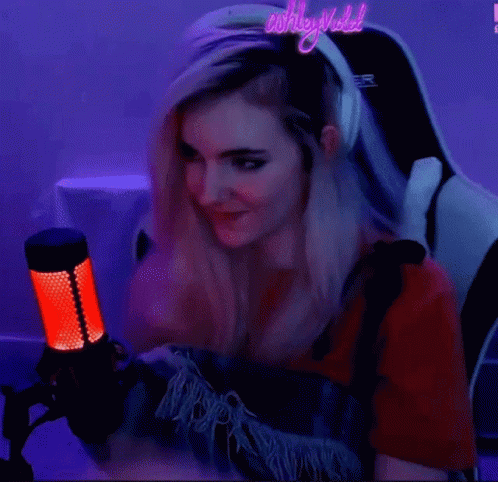 Ashley, wearing headphones and a headband, covers her face in a shy moment during a stream, with a glowing red microphone nearby.