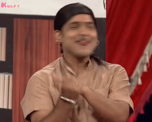 Comedian Get Up Srinu acts shy, smiling and making a coy gesture with his hands in a playful moment.
