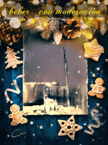 A festive Christmas scene with gingerbread figures and lights, conveying a message to drink in moderation.
