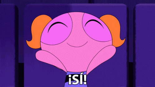 Burbuja (Bubbles) from The Powerpuff Girls is overjoyed, exclaiming '¡SÍ!' (YES!) in a theater setting.