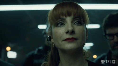 Alicia Sierra, portrayed by Najwa Nimri, from La Casa De Papel, with a confident expression.