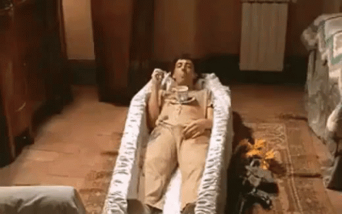 A man lies in a coffin, fanning himself, with the Italian text "Si Muore Di Caldo" (One Dies of Heat) on screen, depicting extreme heat.