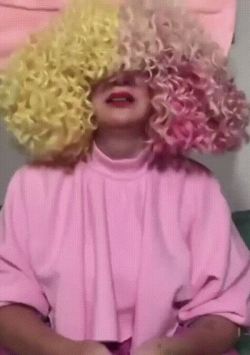 Sia Furler wearing her signature two-tone wig and a large pink bow, expressing herself.