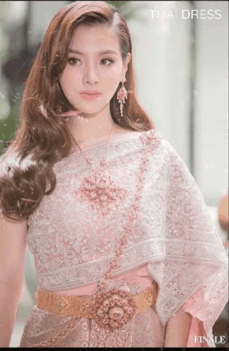 Baifern in an elegant pink and white Thai traditional dress, adorned with intricate jewelry and a golden belt.