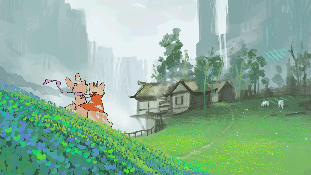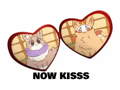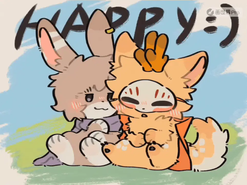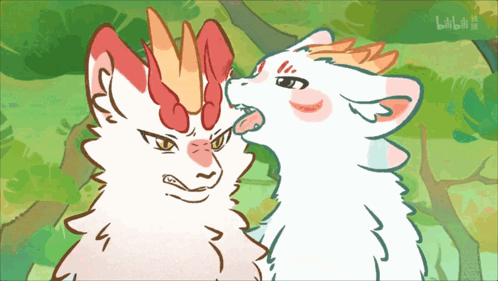 Two mythical creatures from 有兽焉, Sibuxiang, in an animated scene, one playfully licking the other.