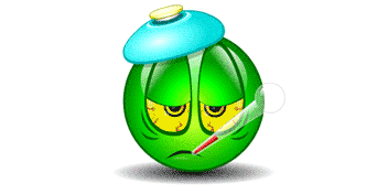 A green sick emoji with an ice pack on its head and a thermometer in its mouth.