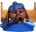 A brown cartoon dog is in bed, looking sick with an ice pack on its head and a thermometer in its mouth.